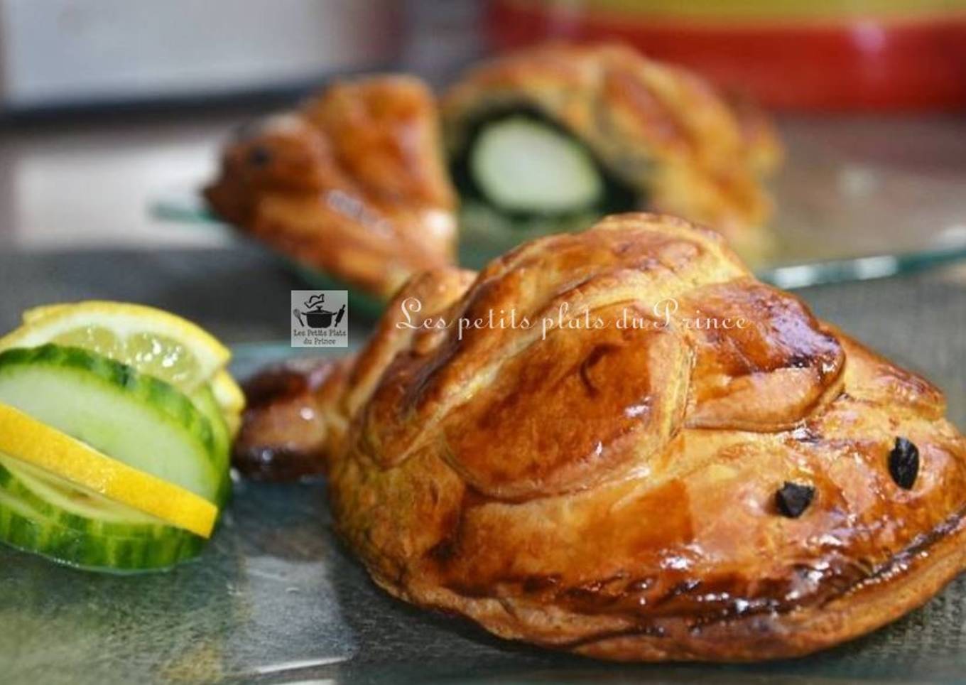 A l'aide de la pointe d'un couteau, faites 2 entailles pour glisser un morceau d'olive noire qui représentera les yeux. - Battez le jaune d’œuf avec un peu d'eau, puis à l'aide d'un pinceau, laquez la pâte feuilletée et collez les écailles.