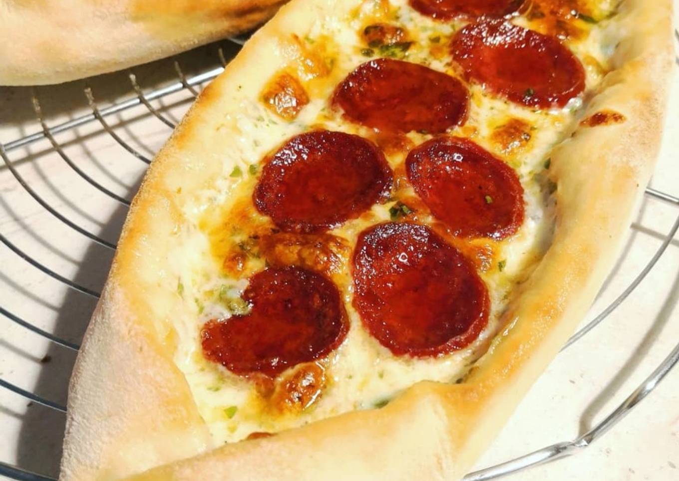 Cette petite pizza turque, en forme de barque, fera le bonheur de vos papilles! Ici elle est au fromage et saucisson turcs, mais on peut la faire à la viande hachée, aux épinards...