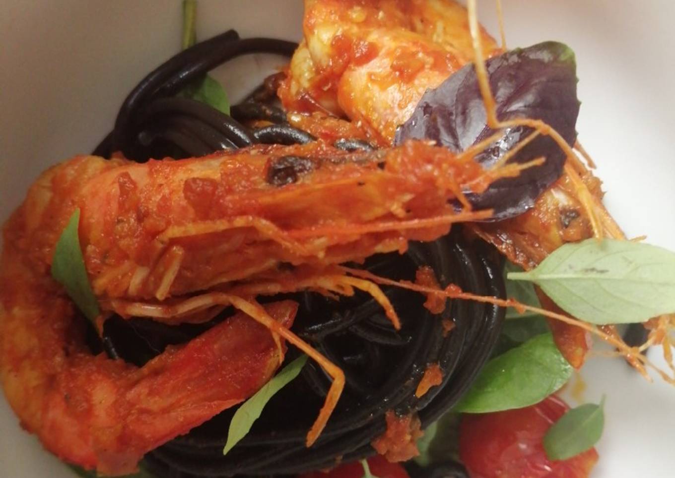 Gambas spaguetti a l'encre de seiche legumes d'été 🦐