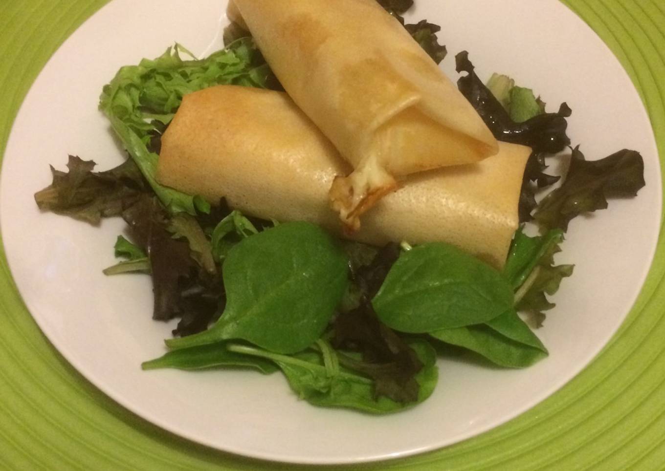 - Disposer les 8 nems, les beurrer légèrement au pinceau et mettre au four préchauffé à 120 degrés pendant 7 à 8 minutes. Cela cuit la feuille de brick. On peut les laisser refroidir et réserver jusqu'à l'apéro... Sinon four à 150 degrés 10 minutes et servir. Sinon pendant l'apéro préchauffer le four à 150 degrés et remettre les nems à réchauffer pour faire fondre le fromage 3 à 5 minutes (à surveiller le fromage s'échappe un peu des coins) et servir sur la salade assaisonnée sans attendre.