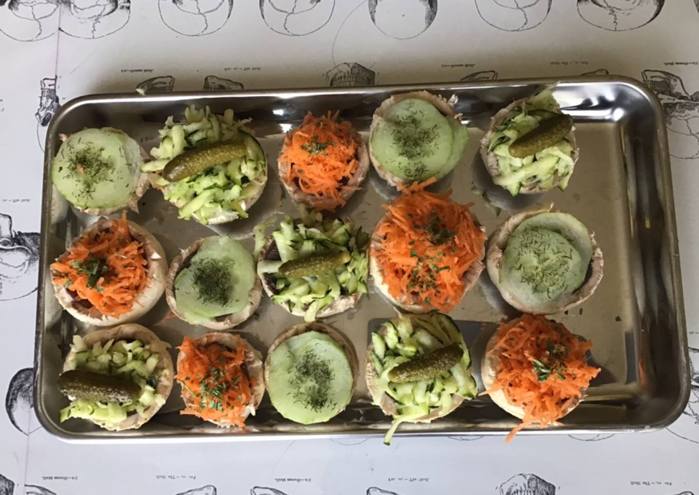 Instructions to make to make Champignons farcis surprise aux carottes courgettes concombre et fromage