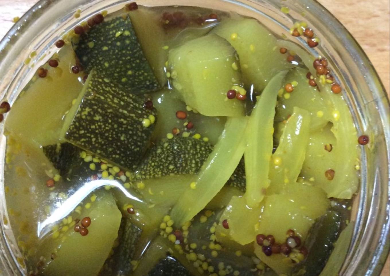 - Mettre dans une cocotte 1/2 l d’eau,1/2 l de vinaigre blanc, 300g de sucre semoule, 4 cc rases de curry, 2 cs de moutarde à l’ancienne.Ramener à ébullition 5 min en tournant de temps en temps.Rincer les courgettes à grande eau, égoutter, verser le mélange sur les courgettes après ébullition.