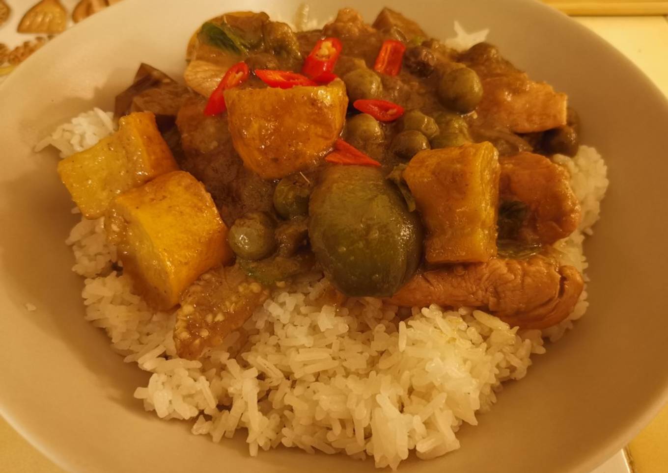 - Cuisson du Riz (pendant la cuisson du Curry) : Laver 400ml de RIZ THAI à 3 reprises - Mettre le RIZ dans une cocotte et Verser 800ml d'EAU et mettre à feu doux - A ébullition couvrir et laisser cuire à feu doux pendant 20 minutes en remuant de temps en temps - Quand il n'y a plus d'EAU couper le feu et reserver à couvert