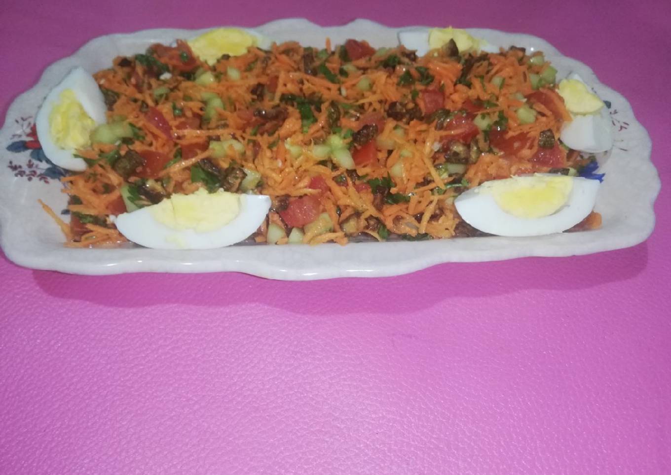- On coupe concombre et tomate en petits dés, on râpe la carotte, on coupe le Persil puis mélanger tous les ingrédients et la touche finale persil et œufs, bonne dégustation