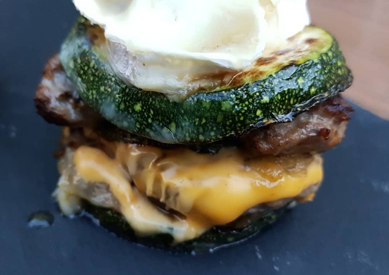 - ...puis le steak une tranche de cheddar coupé en deux puis courgette oignons steak cheddar et courgette. Pour finir le burger les 2 morceaux de chèvre sur le dessus.