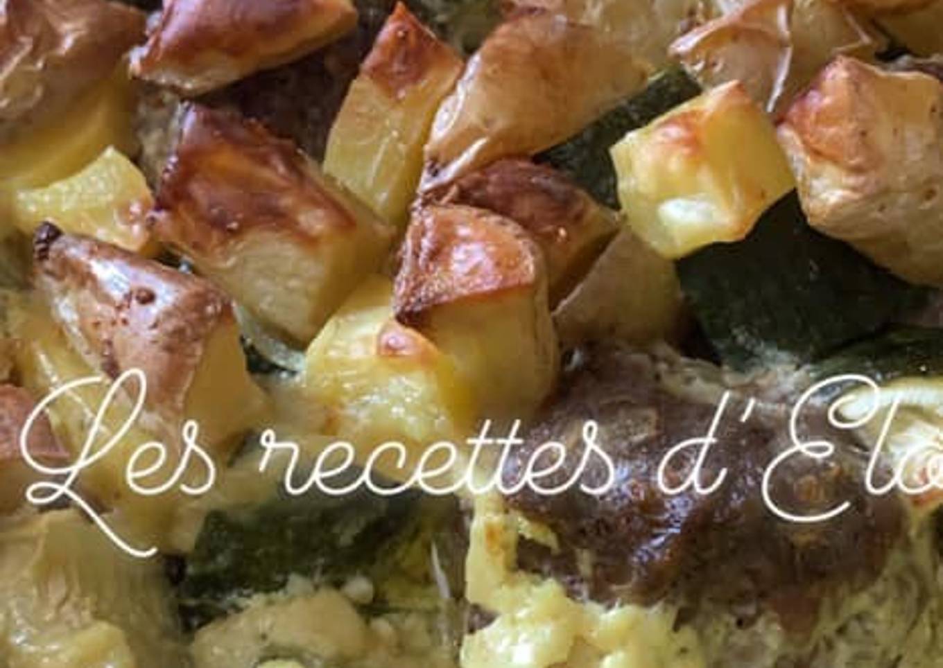 - Dans un plat allant au four, disposer les boulettes, les morceaux de courgettes et de pommes de terre.