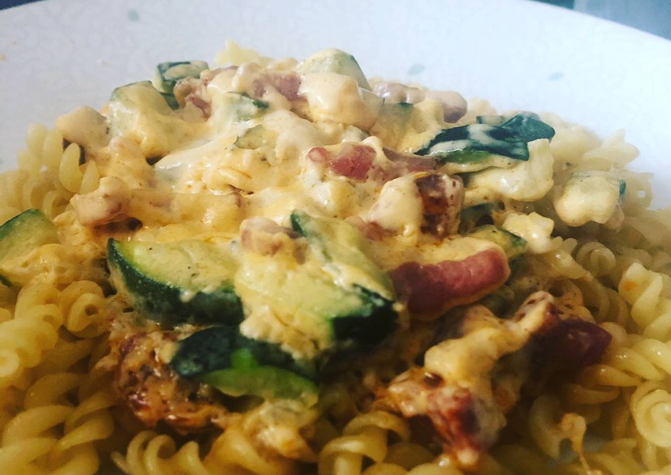 Pâtes 🍝 courgettes, lardons, chorizo et sauce chèvre frais 🥭