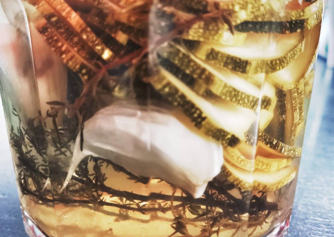 - Pendant ce temps mettez vos rondelles de courgette dans les pots avec une belle branche de thym frais et 3 gousses d'ail par pot.